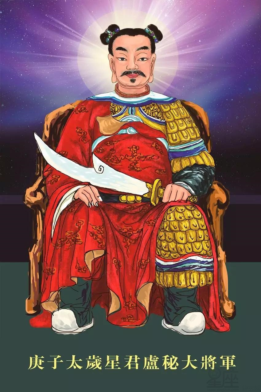 很多道教的宫观都有元辰殿,供奉着六十位太岁神。每一位太岁都有姓名,对应着不同的“天干”。因为他们顺序值年,周而复始,循环不息,从甲子年的金赤大将军至癸亥年的虞程大将军,依六十甲子轮流掌管人间一年的吉凶祸福,故又称“值年使者”,或“值年太岁”。比如乙未年的值年太岁星君是杨仙大将军,丙申年的值年太岁星君是管仲大将军,2020年农历庚子年的值年太岁星君为卢秘大将军。