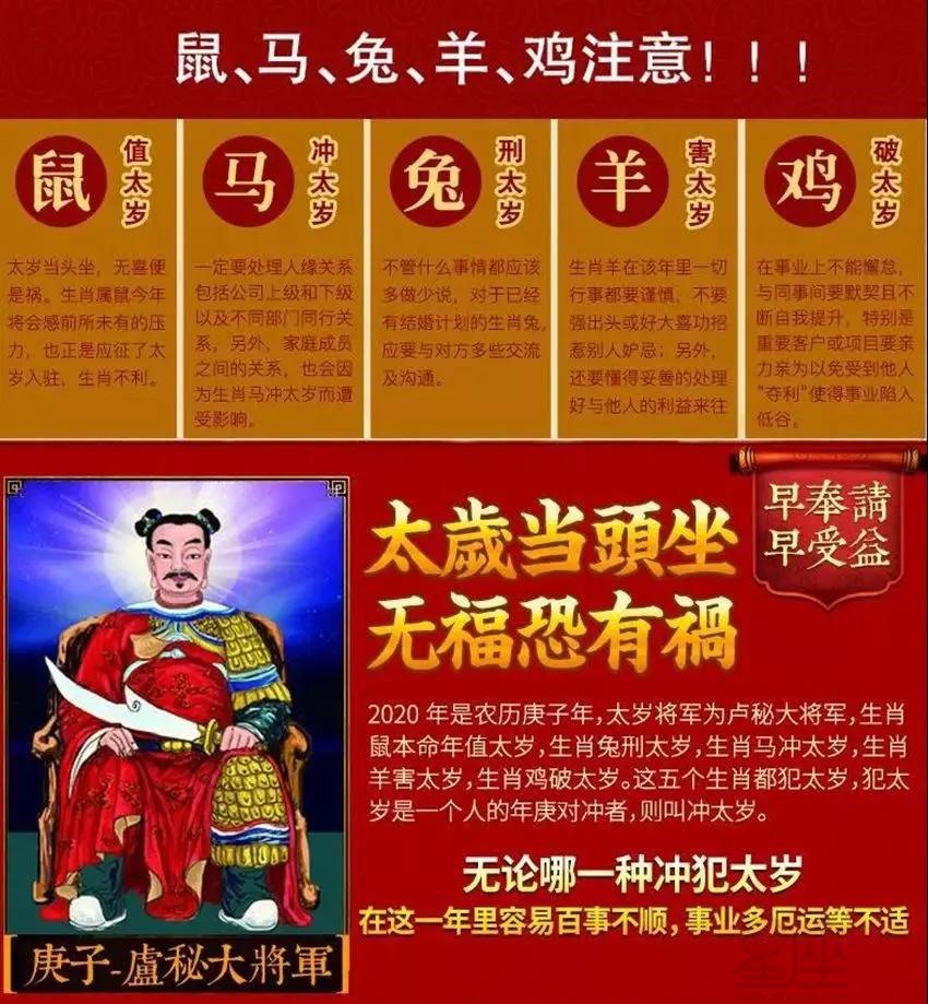 2020年为农历庚子年(鼠年),值年太岁星君为卢秘大将军,值年太岁(亦称本命太岁)掌管该年吉凶祸福,依据道家传统理论及流年地支与五行生克的关系,属鼠、属马、属羊、属兔、属鸡之人冲犯了庚子年的本命太岁,生肖属鼠的叫值太岁,也叫本命年、生肖兔为刑太岁、生肖马为冲太岁、生肖羊为害太岁、生肖鸡为破太岁。