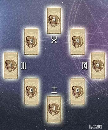 塔罗牌的风火水土四元素占卜法,主要用于占卜事业、爱情。问者常用此牌局占卜事情的前因后果。牌阵如下图。