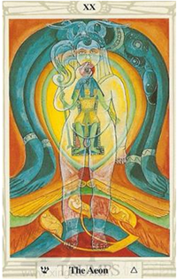 最后的审判(The Last Judgement)并非世界末日的审判,而是在昭示一个重要信息的到来:这是一个重要的时刻,有重要的事情要被宣布,暗示一整群人受到影响,而不止是一个人的事。重大的觉醒与改变,唤醒觉醒的重要讯息要来到。克劳利认为用“The Aeon”不易让人们产生误解。伟特塔罗中大天使对着人们吹响喇叭,是同样的意涵。时代的变迁与交替,也暗示了传承与演变。