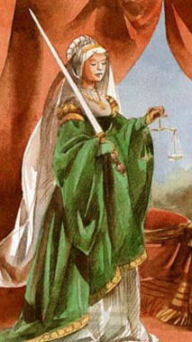 牌面描绘着冷酷的正义女神端坐在石椅上,右手拿着一柄正义之剑,左手拿着一架辨识善恶天平。凭借这两样圣器正义女神能轻易地了解事情的来龙去脉与未来的发展,让她轻松面对眼前的一切。同时也让世人知道因果循环的道理,警告人们要有宽容的心胸,遵守道德,坚持正义。